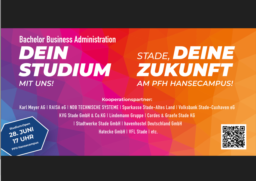 Ob praxisnahe Projekte, abwechslungsreiche Schwerpunkte oder spannende Module: Das Studium Business Administration (B.Sc.) bereitet umfassend auf den Berufseinstieg vor. Der im Oktober 2023 am Hansecampus Stade der PFH startende Studiengang Business Administration (B.Sc.) kann in enger Kooperation mit einem namhaften Praxispartner absolviert werden, z.B. Karl Meyer AG, RAISA eG, NDB TECHNISCHE SYSTEME, Sparkasse Stade-Altes Land, Volksbank Stade-Cuxhaven eG, KVG Stade GmbH & Co. KG, Lindemann Gruppe, Cordes & Graefe Stade KG, Stadtwerke Stade GmbH, havenhostel Deutschland GmbH, Hatecke GmbH oder VfL Stade.